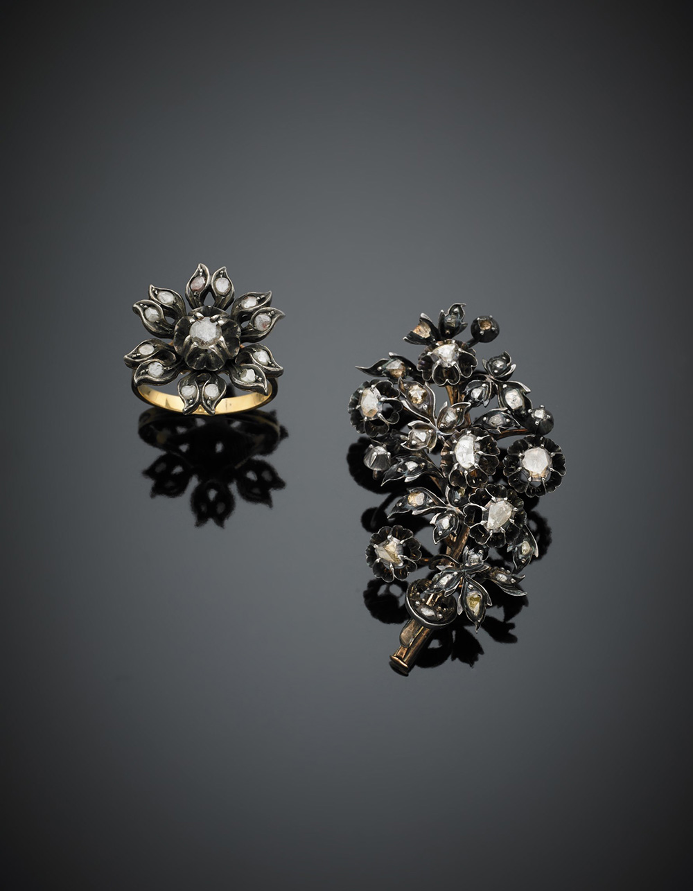 Yellow gold, silver and diamond lot composed of brooch and ring, in all g 18.40, length cm 5 circa size 15/55.