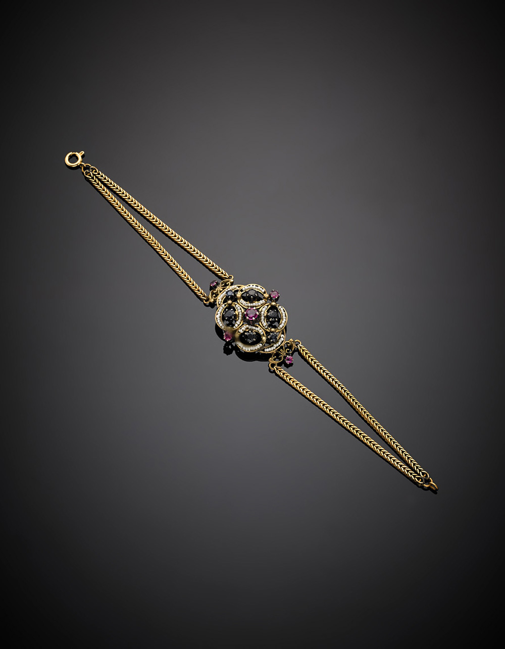 Bracciale in oro giallo con micro perle, zaffiri e rubini g 10,28, lungh. cm 16 circa. (lievi difetti)