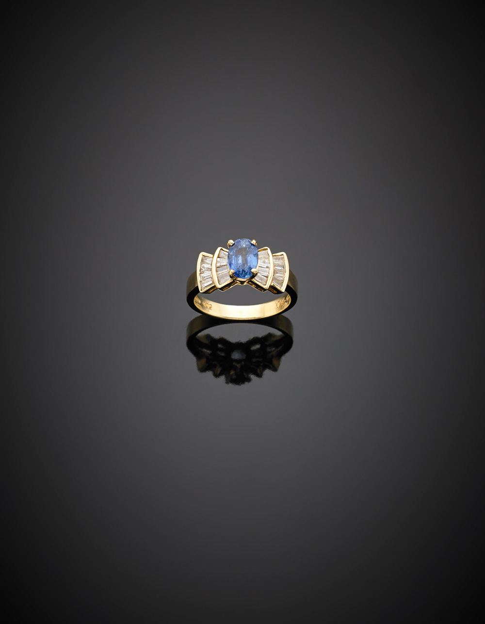 Anello in oro giallo con diamanti a baguette e zaffiro ovale, g 3,75 misura 11/51.