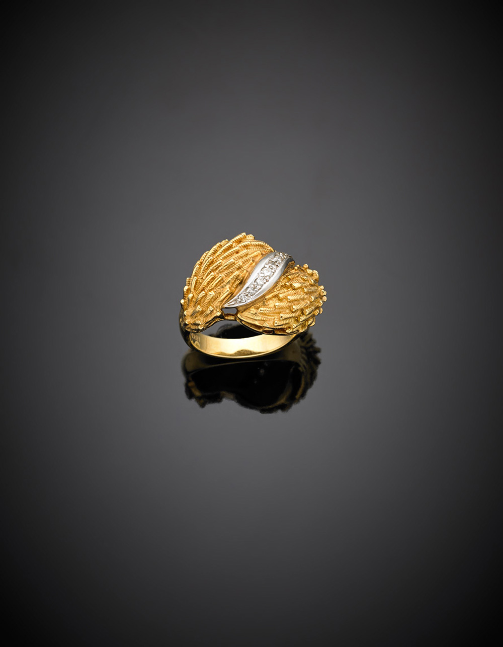 Anello in oro giallo e bianco con piccoli diamanti, g 10,79 misura 12/52.