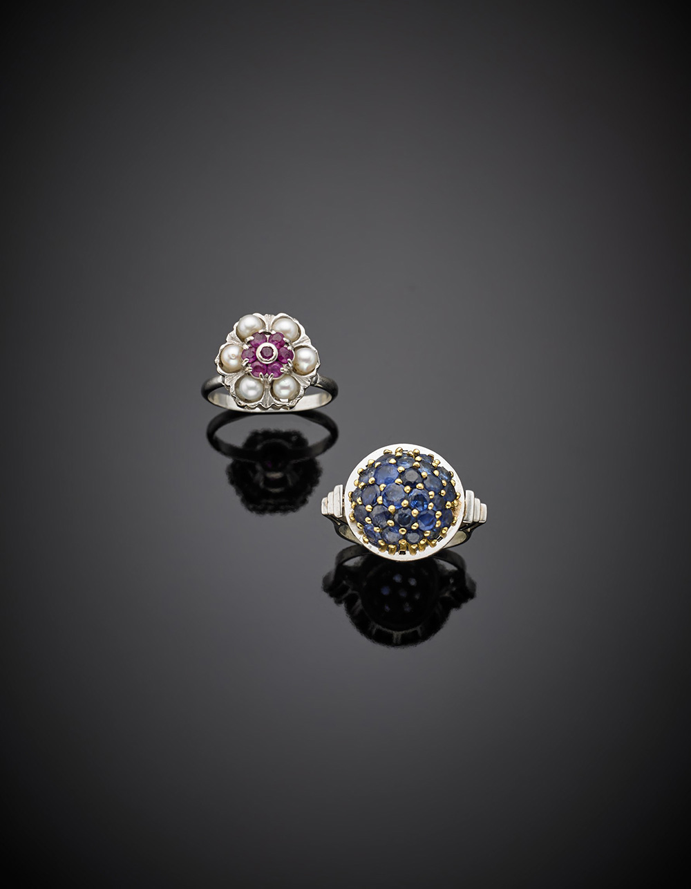 Lotto 1659 | Due anelli in oro bianco e giallo, perle e rubini il primo, con zaffiri il...