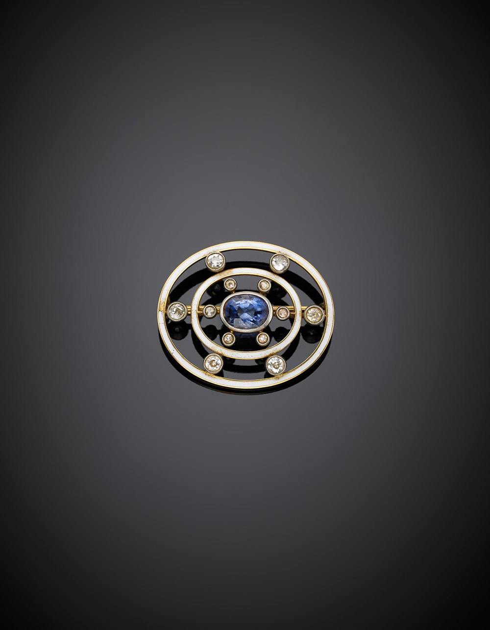Spilla ovale in oro giallo e smalto bianco con diamanti rotondi e zaffiro ovale centrale di ct. 2,60 circa, g 9,44, largh. cm 3,50 circa. (lievi difetti)Yellow gold, diamond, white enamel and central oval ct. 2.60 circa sapphire brooch, g 9.44, width cm 3.50 circa.(slight defects)