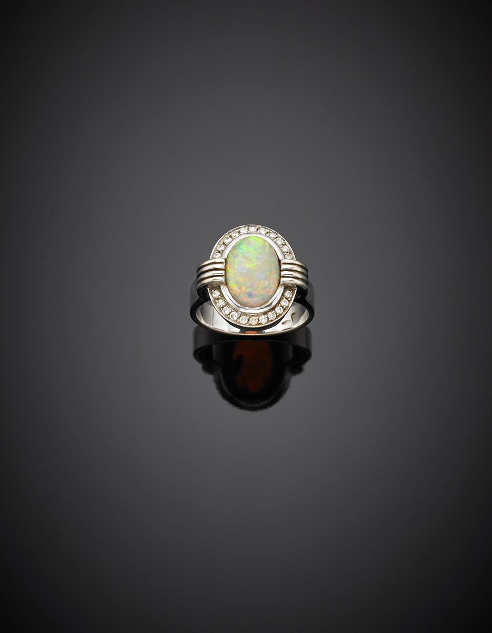 Anello in oro bianco con diamanti e opale nobile ovale cabochon g 9,17 misura 16/56.