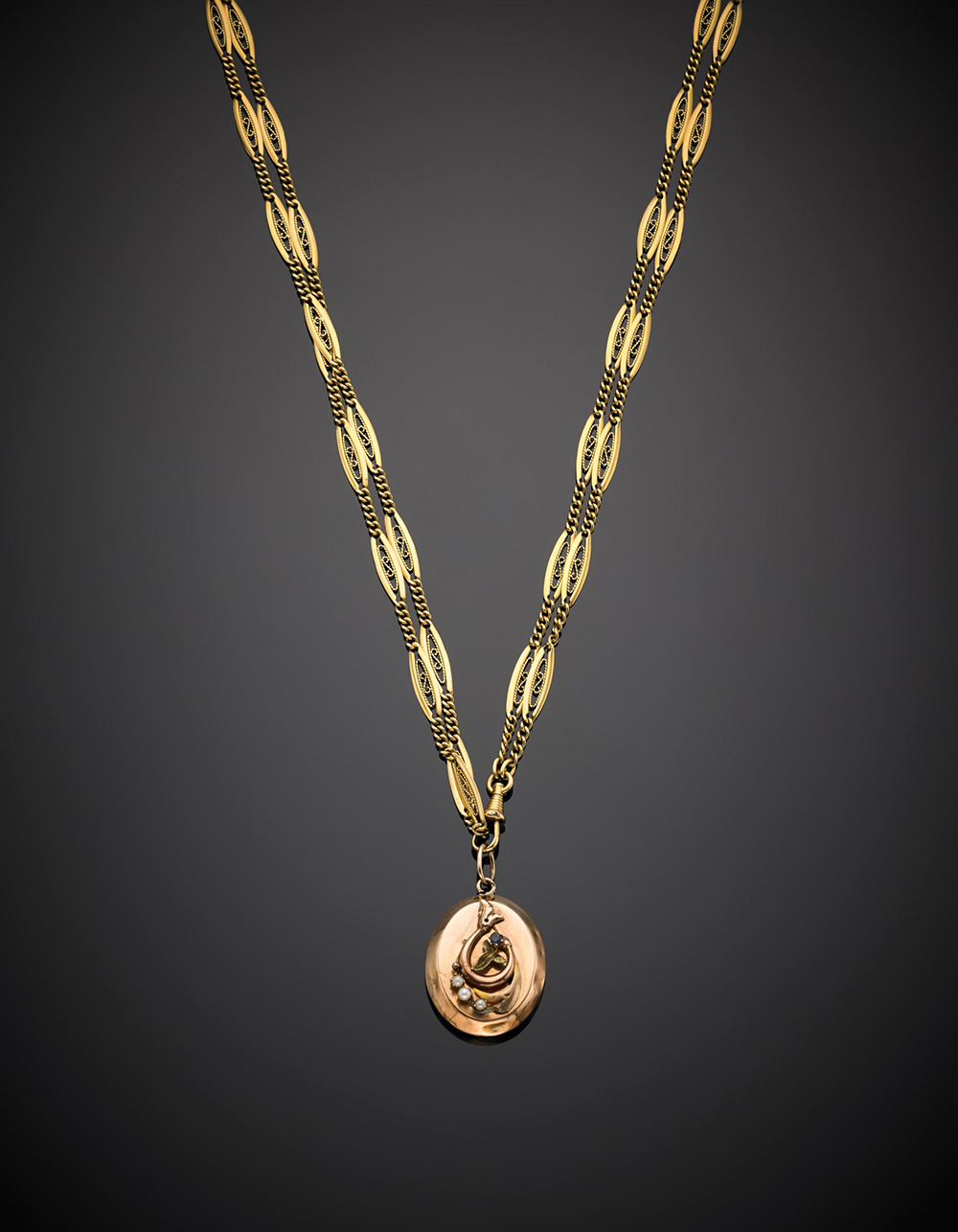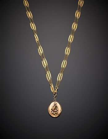 Catena lunga a losanghe in oro giallo con ciondolo più antico in oro rosso,...