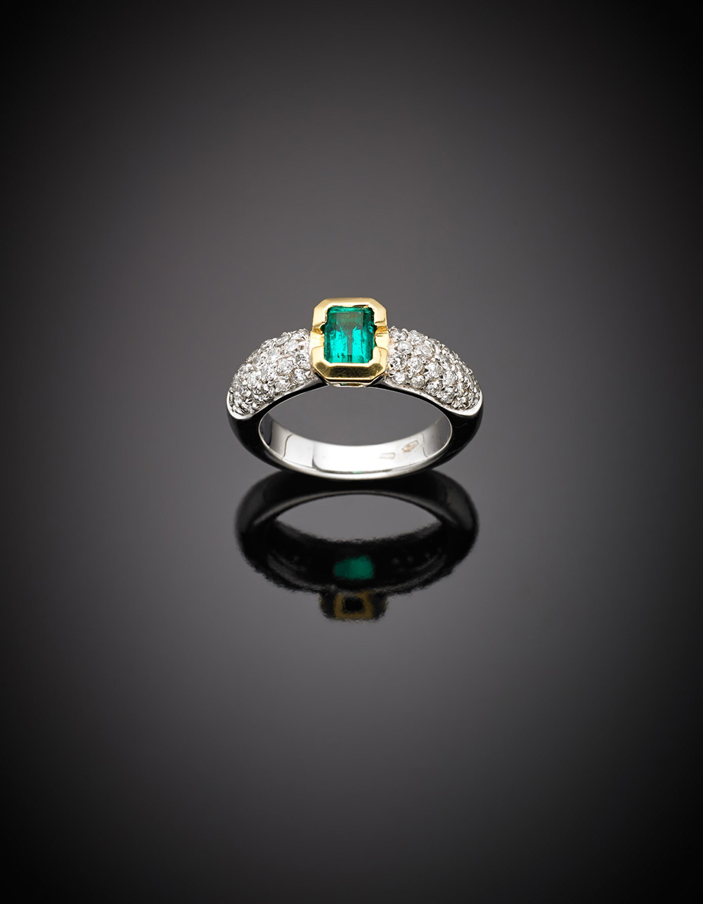 Anello in oro bianco con smeraldo e pavè di diamanti g 9,15 misura 14/54.