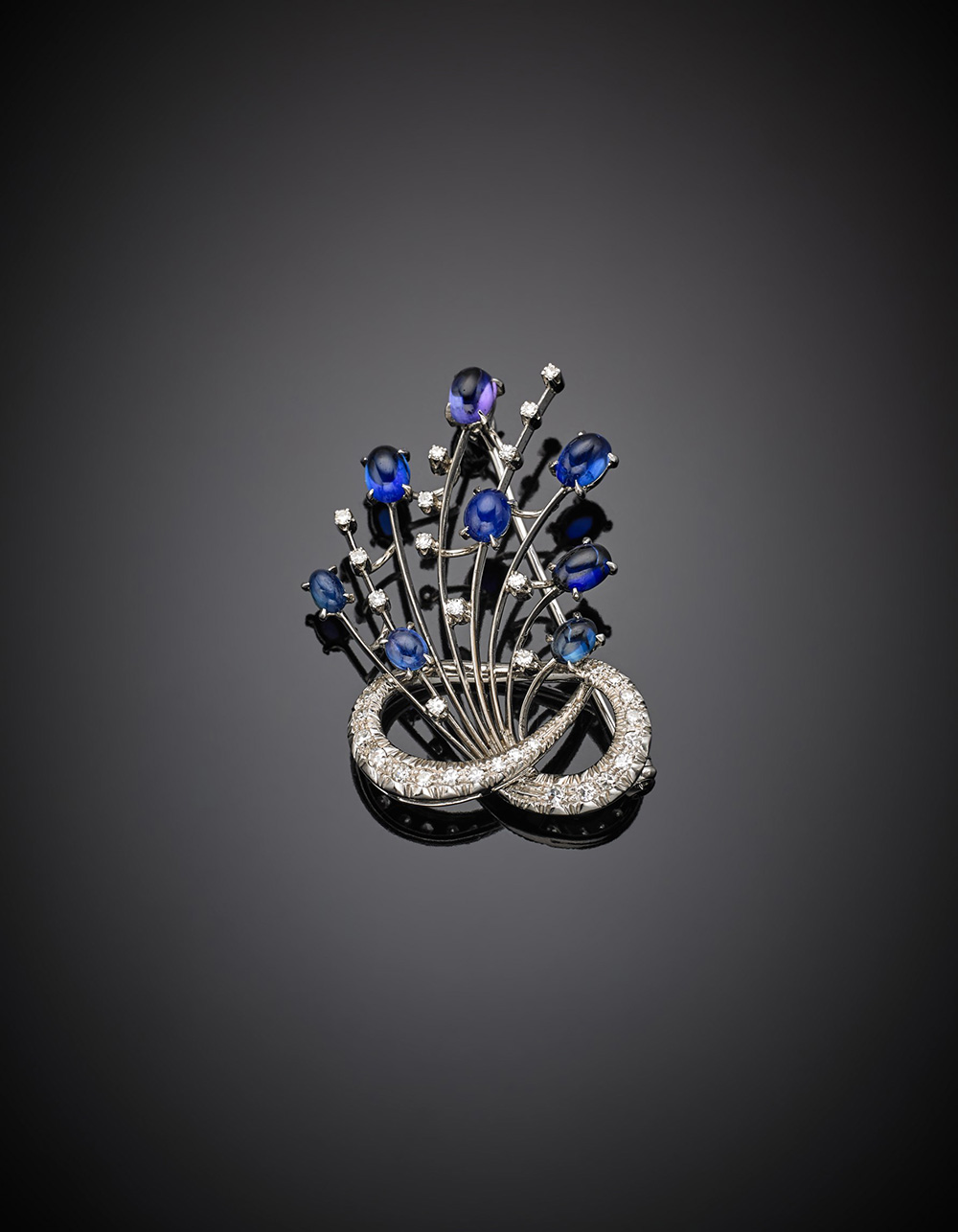 Broche in oro bianco a bouquet stilizzato, con diamanti e zaffiri ovali cabochon, g 12,38, lungh. cm 5 circa.