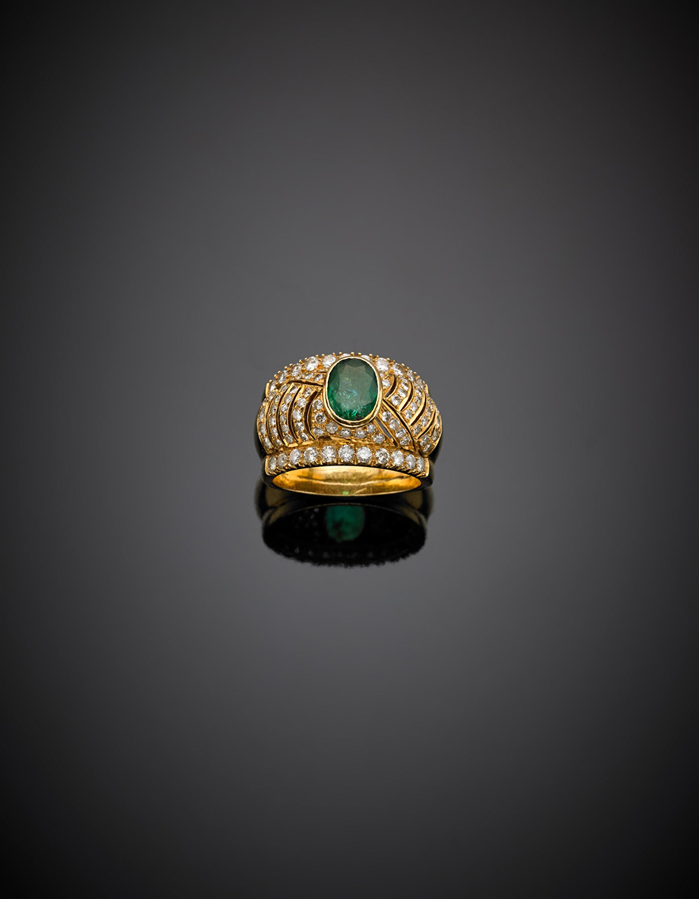 Lotto 1713 | NOELLOAnello in oro giallo a fascia bombata con diamanti rotondi e smeraldo...