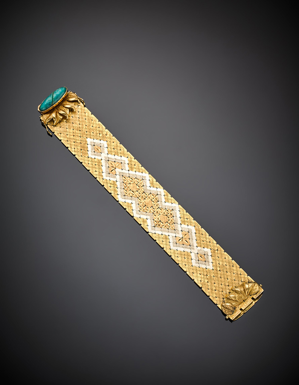 Bracciale a fascia articolata in oro giallo, bianco e rosa, in parte cesellato con avventurina sulla chiusura a guisa di fiore, g 85,44, lungh. cm 20, h cm 3 circa. (lievi difetti)