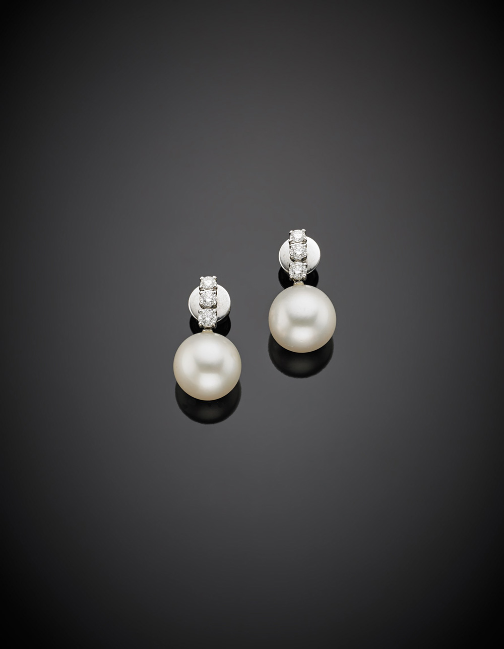 Orecchini in oro bianco con diamanti e due perle South Sea bianche, g 13,91, lungh. cm 2,60 circa. Diam. perla mm 14.70 circa