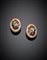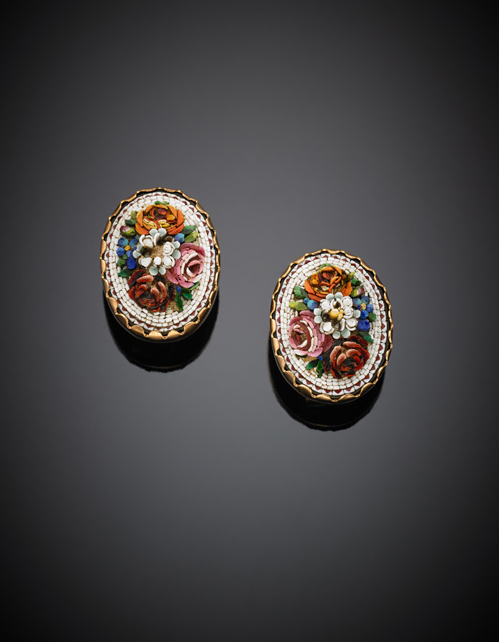 Orecchini a lobo con clip in oro giallo rossastro con micromosaico floreale a rilievo, g 10,40. (lievi difetti)