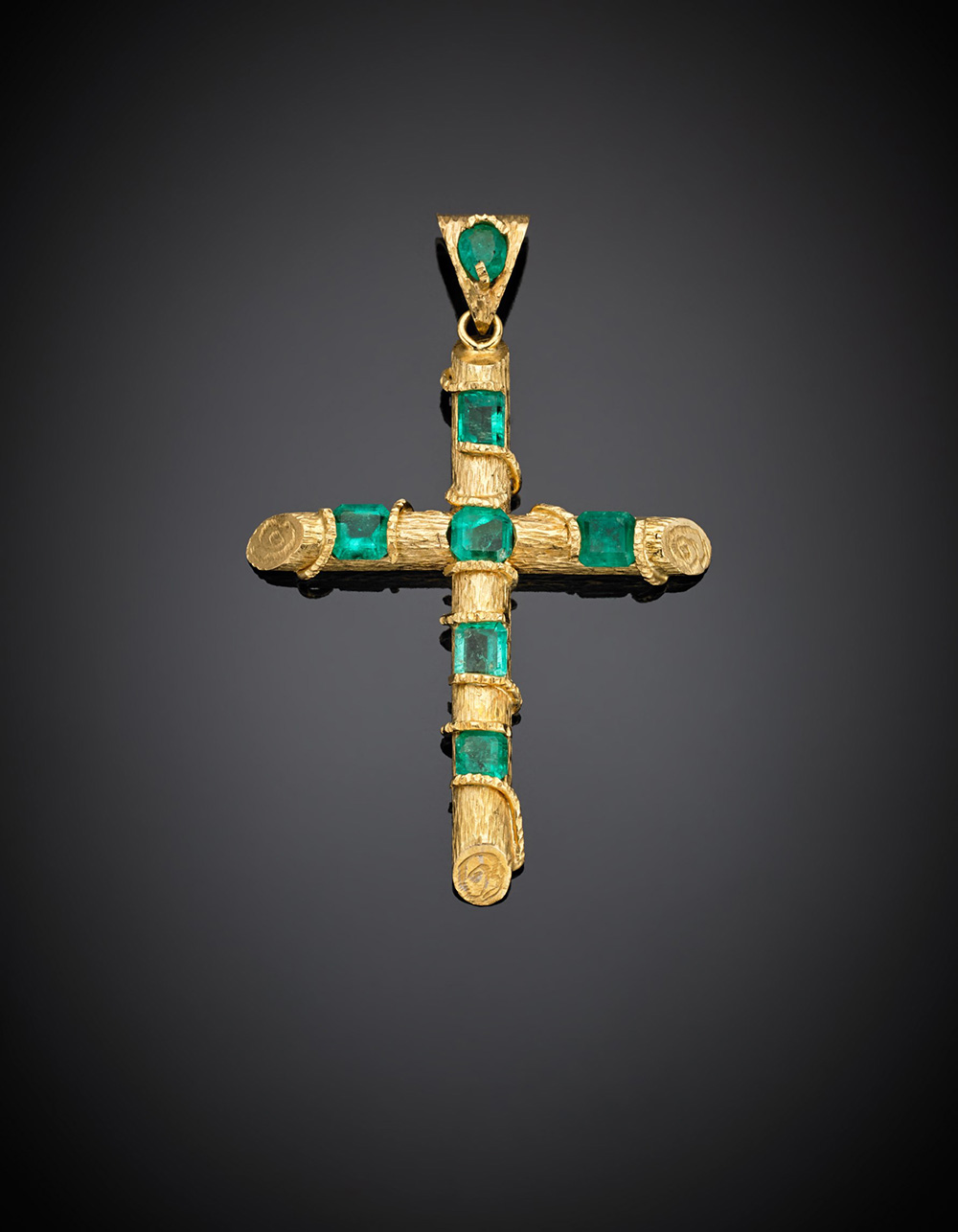 Croce in oro giallo con sette smeraldi, g 9,39, lungh. cm 6,50, largh. cm 4,50 circa.