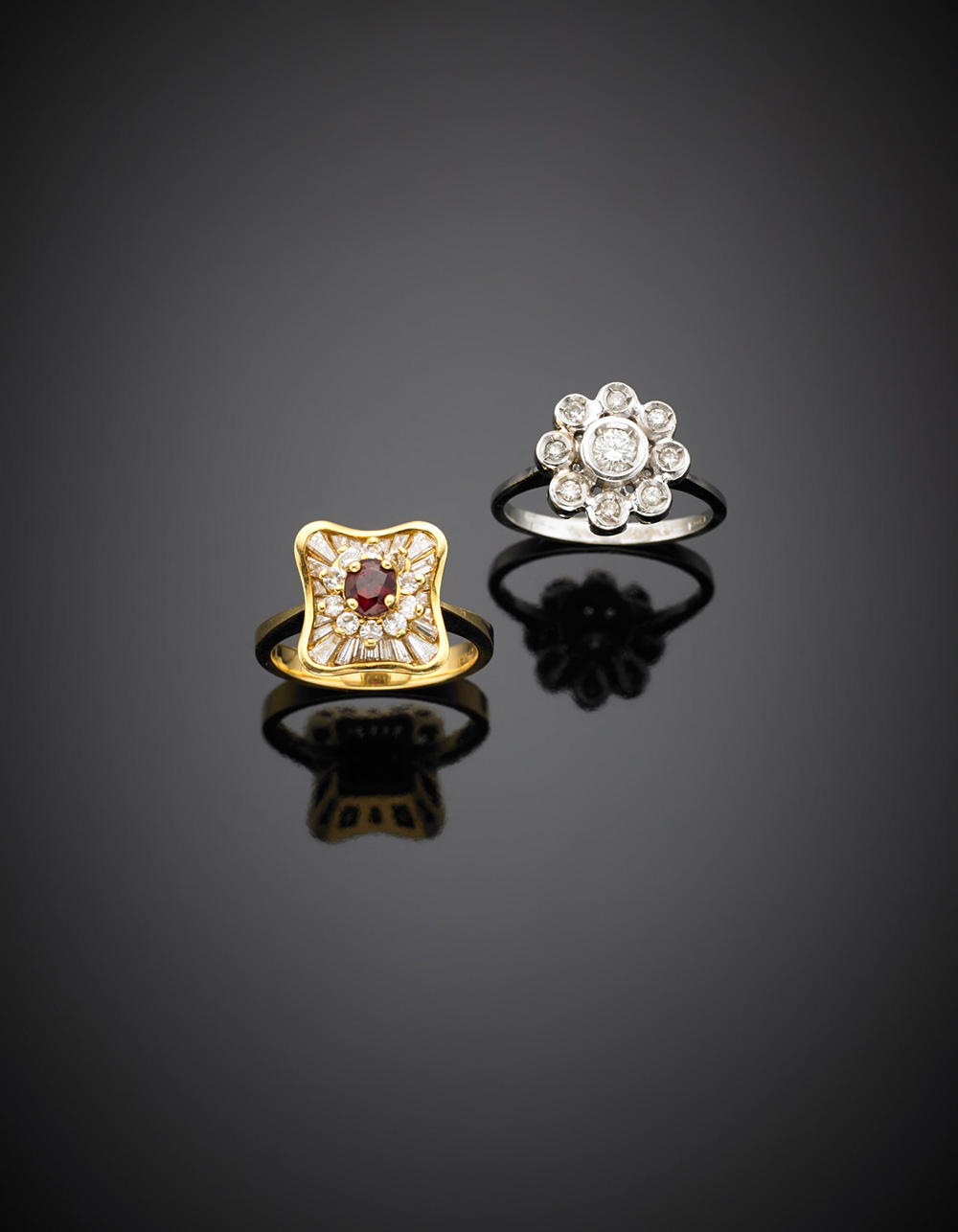 Due anelli a fiore in oro bianco e giallo, con diamanti il primo, rubino e...