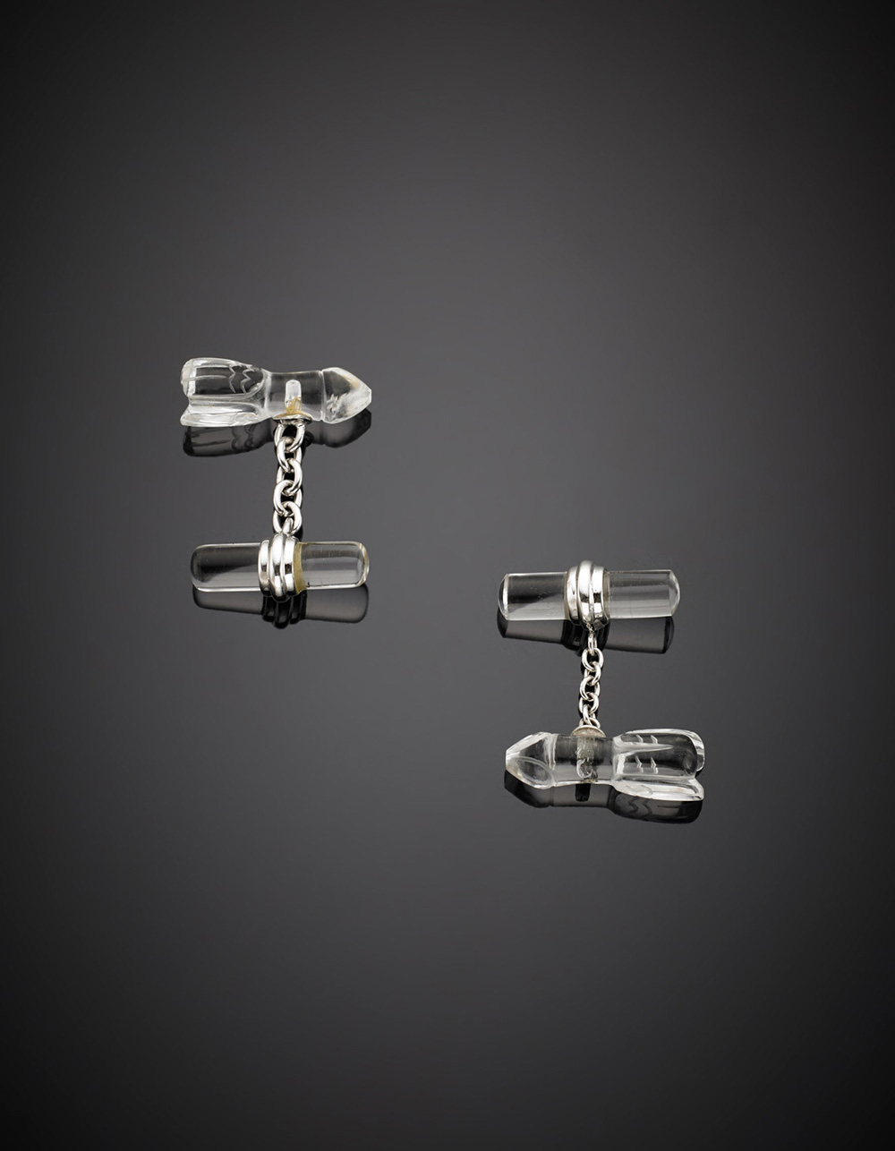 Lotto 1739 | Gemelli "Sogno erotico" in oro bianco e quarzo ialino, g 7,13.White gold...