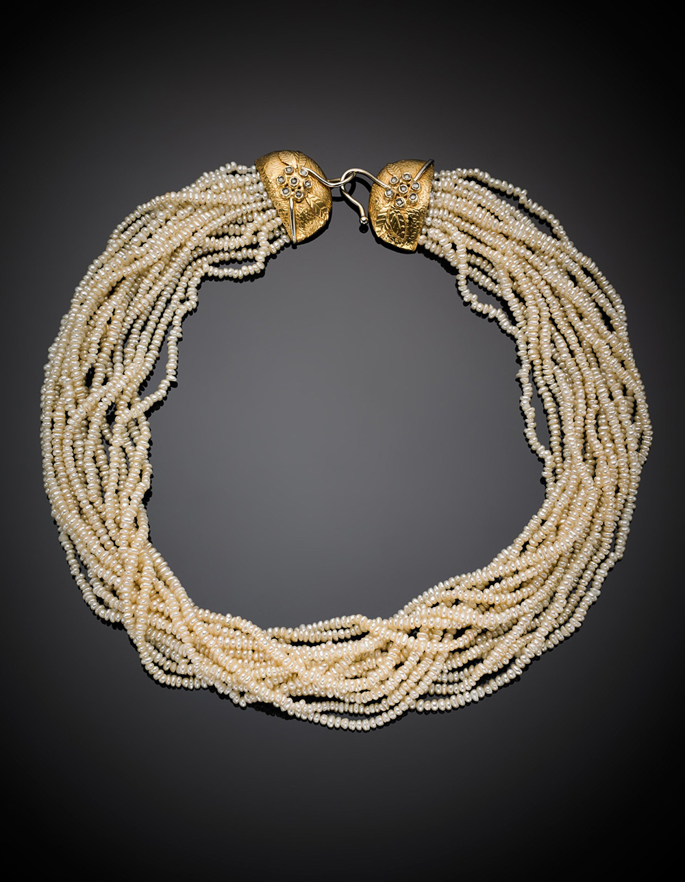 Chiusura in oro giallo e bianco a disegno floreale, rifinita con diamanti a tenere quindici fili di perle coltivate d'acqua dolce bianche irregolari, g 140,56, lungh. cm 49 circa.