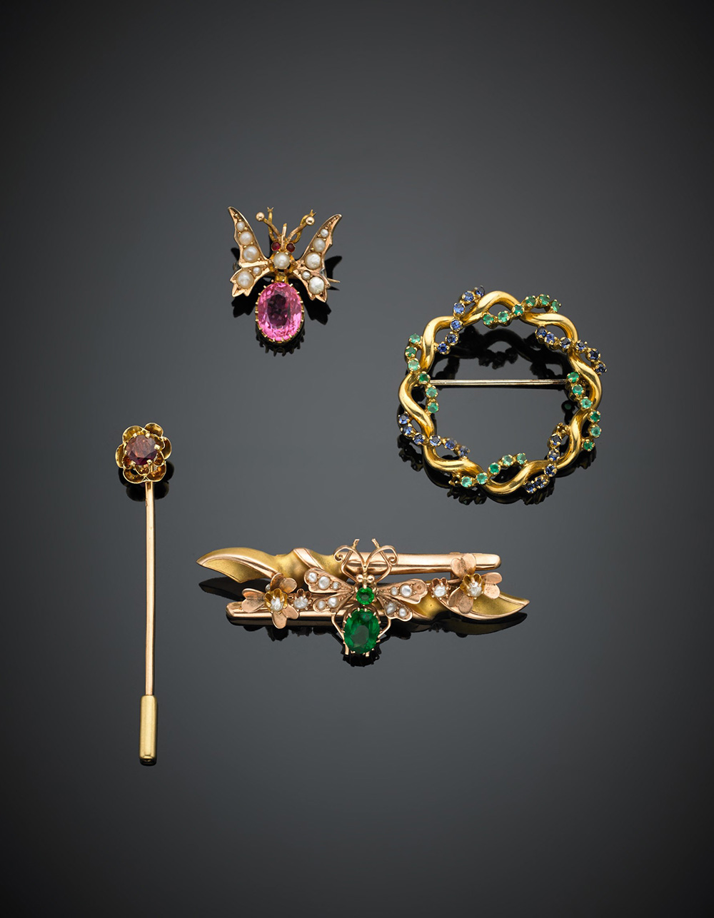 Lotto composto da quattro tra spille e spilloni in oro giallo e rosso da 333/1000 a 750/1000, rifinite con gemme varie, complessivi netti g 19,20.