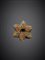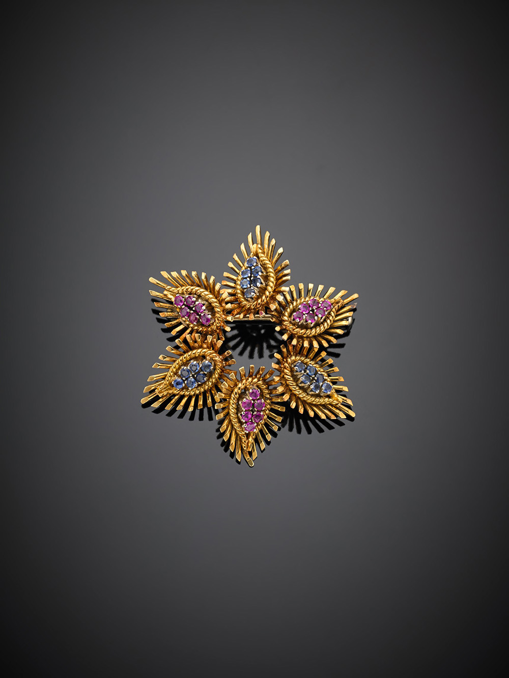 Spilla in oro giallo e bianco a fiore con zaffiri e rubini, g 11,81, diam. cm 4,10.