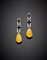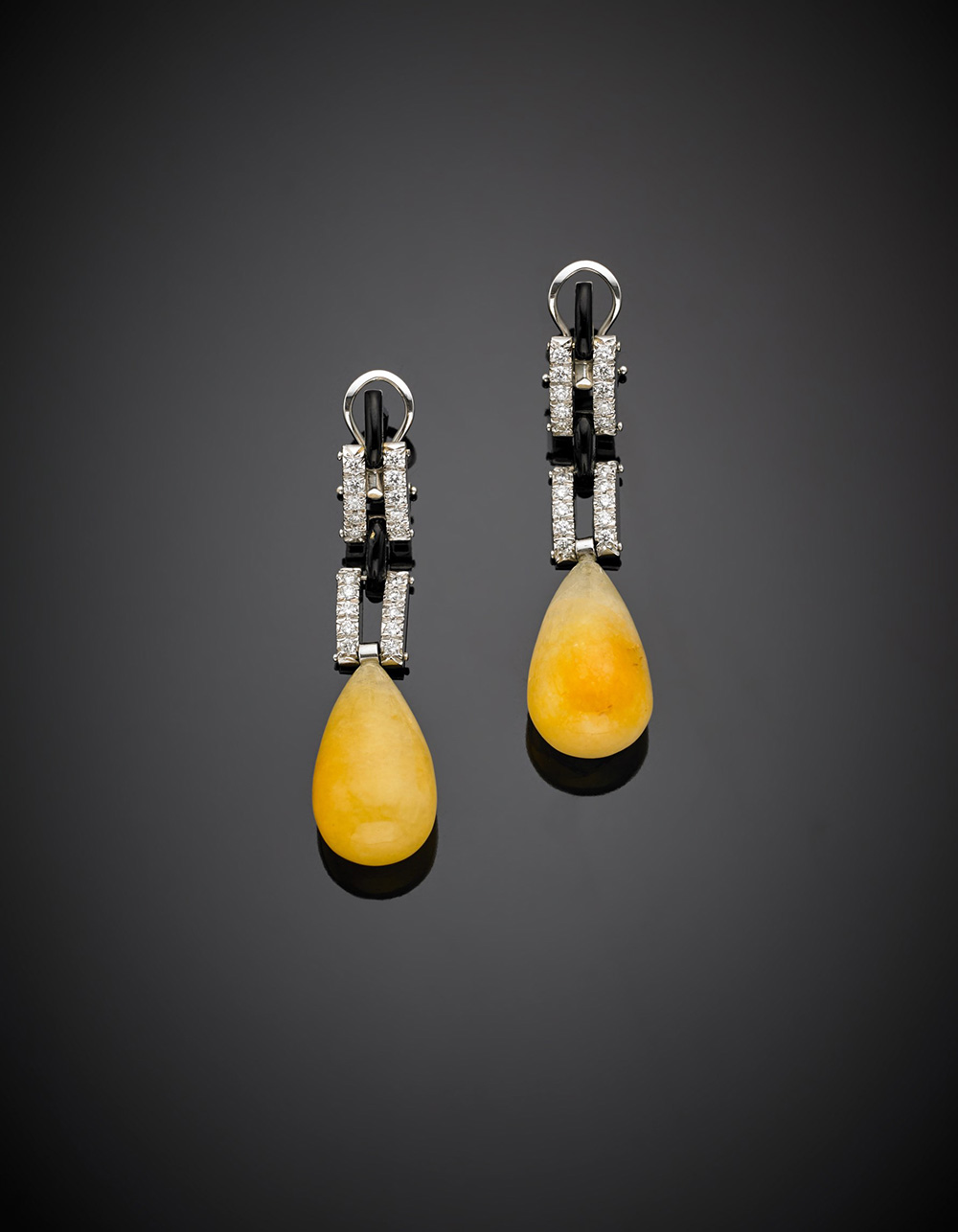 Orecchini in oro bianco con smalti neri e quarzi microcristallini citrini, a goccia, g 14,89, lungh. cm 4,90 circa. In scatola di Nardi