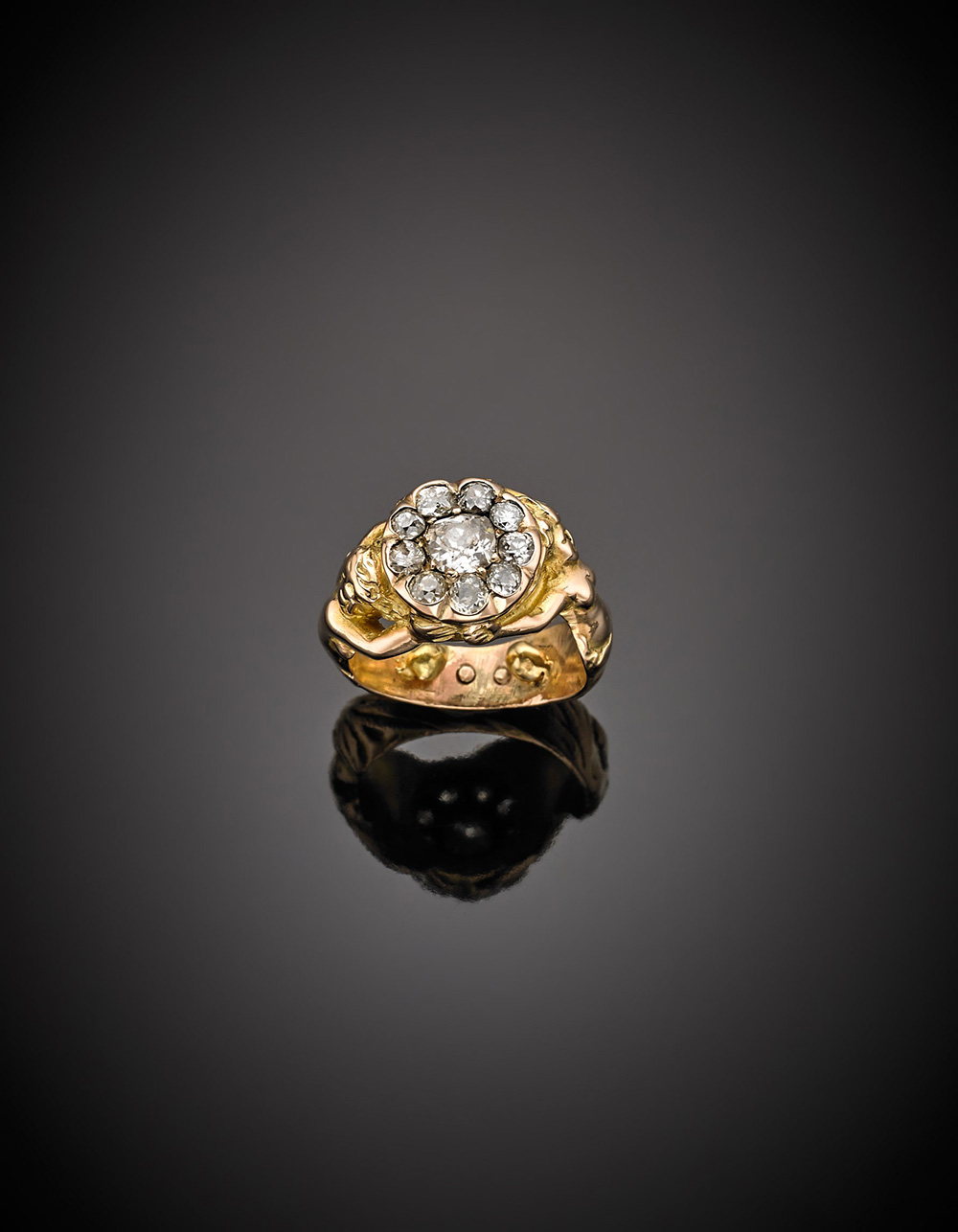 Anello in oro giallo con diamanti taglio old mine, formato da due figure femminili che sostengono un paniere , g.13,80 circa g 13,87 misura 14/54.