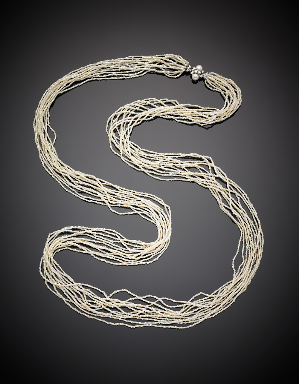 Lotto 1751 | Lunga collana a dodici fili di micro perle, chiusura in oro bianco diamanti...