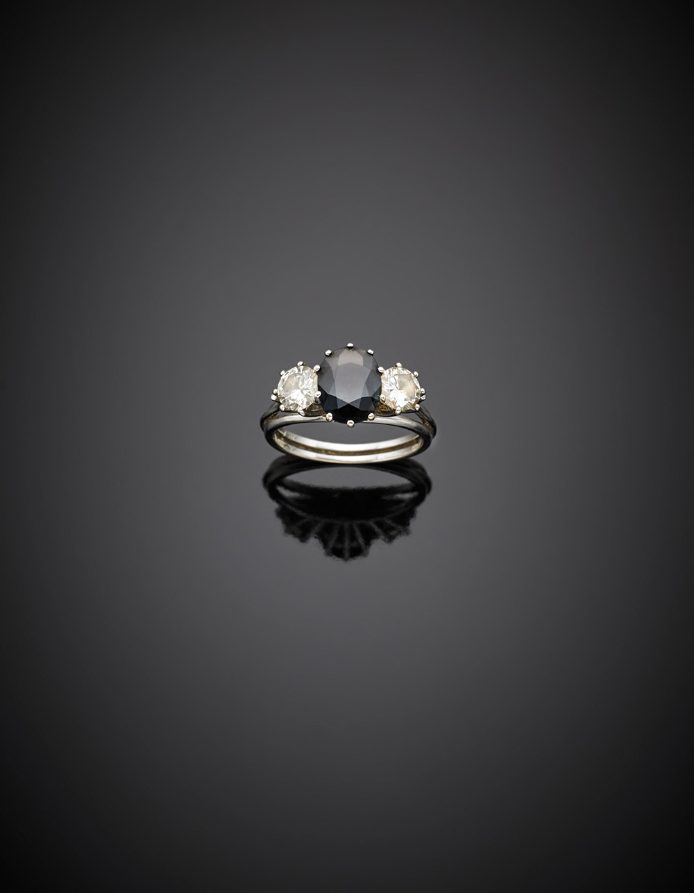 Anello in oro bianco con zaffiro ovale e due diamanti ai lati per complessivi ct.0.80 circa, g 3,90