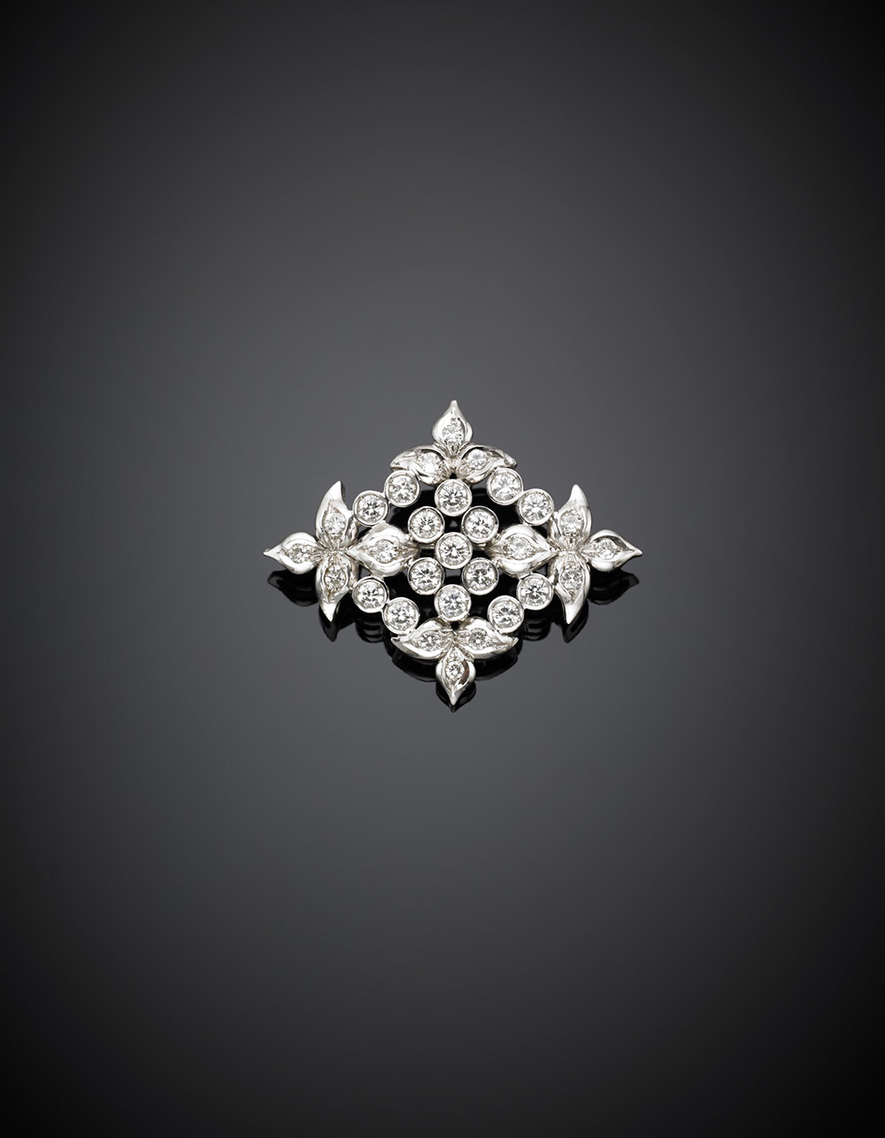 Spilla a losanga in oro bianco, rifinita con diamanti, per complessivi ct....