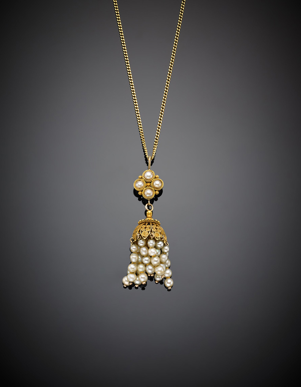 Yellow gold link chain and filigree pendant with pearl tassel, g 15.31, length cm 51 circa.