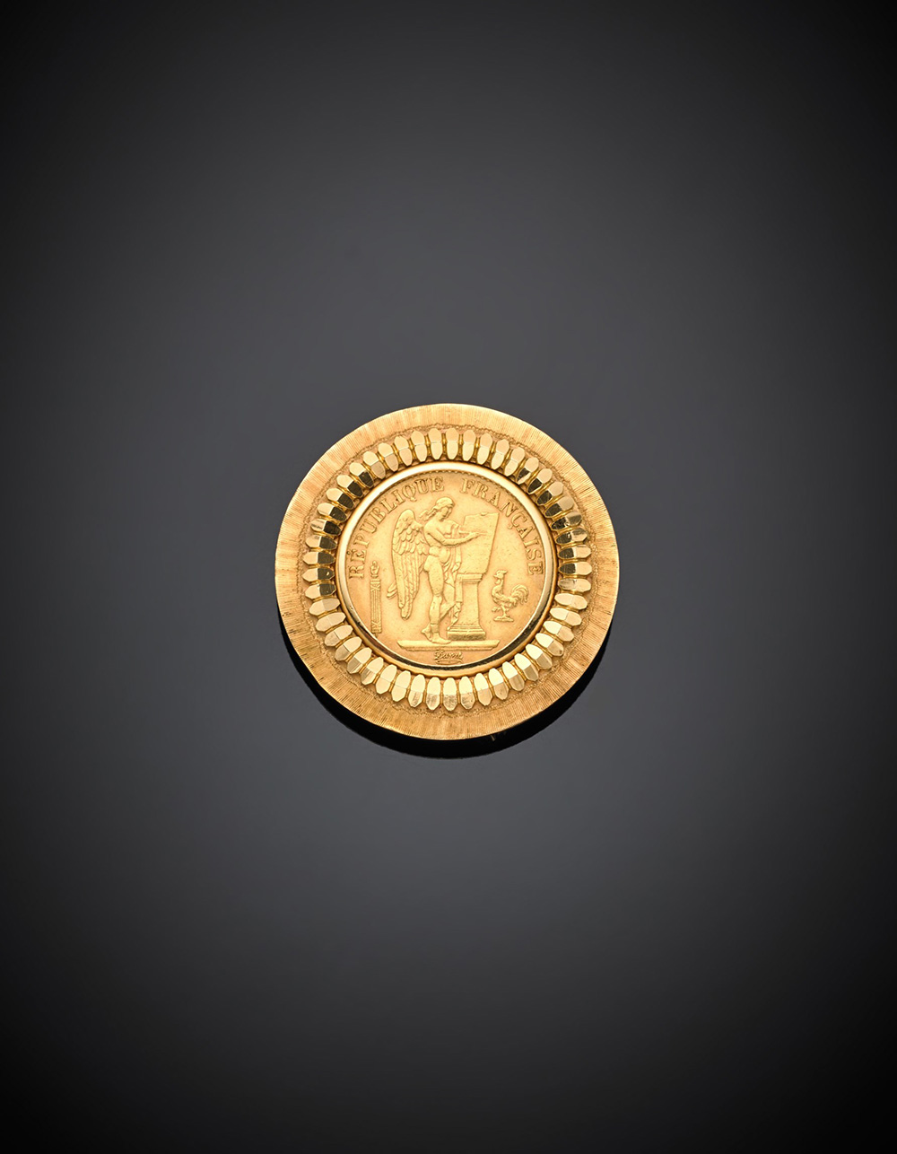 Spilla in oro giallo con al centro moneta francese da 20 franchi 1893, g...