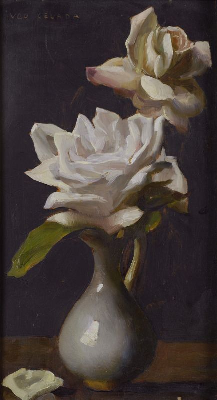 Ugo Celada da Virgilio (Virgilio, 1895 - 1995) Rose bianche Olio su compensato, cm. 27,5x16 Firma in alto a sinistra.