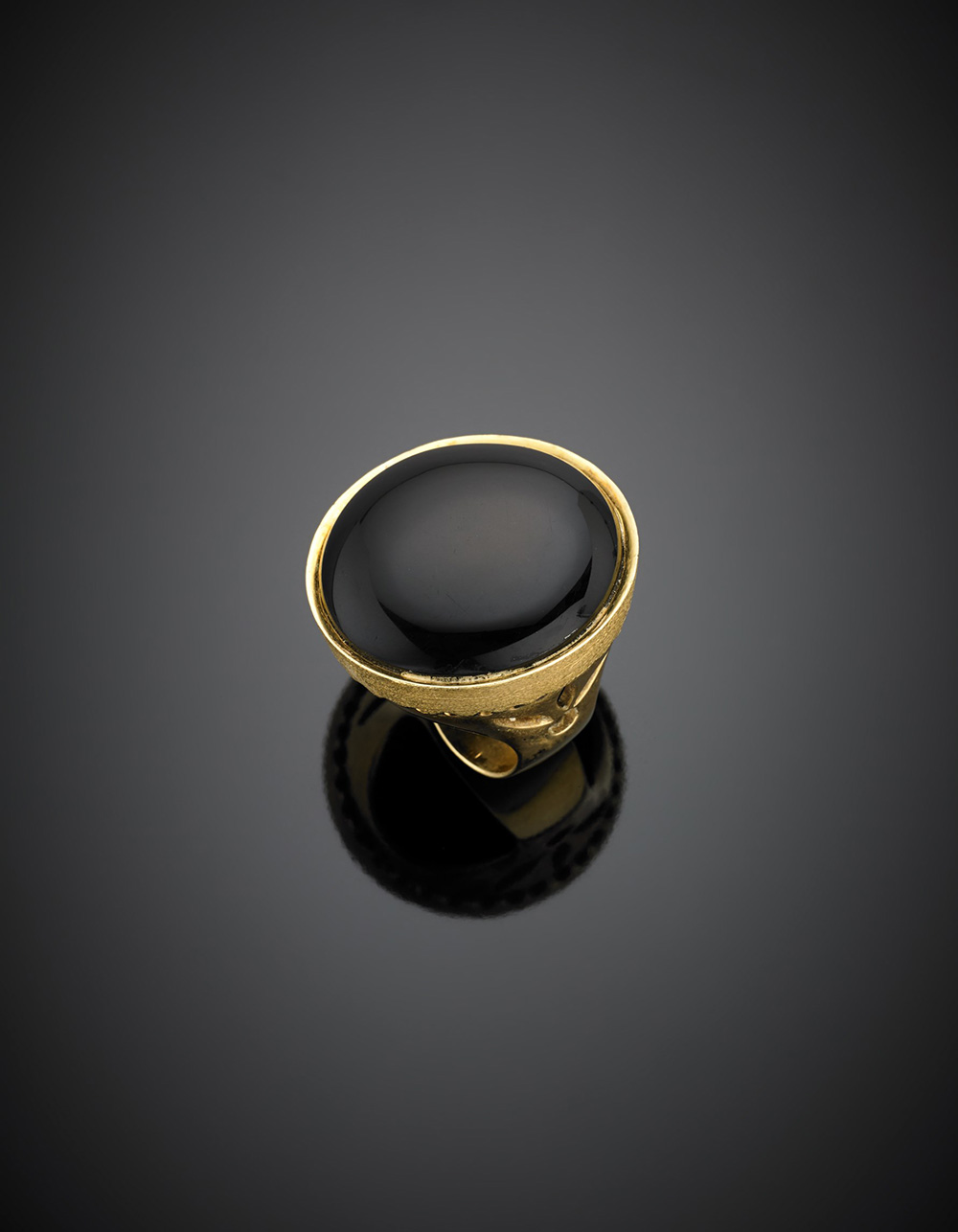 Grande anello in oro giallo con onice rotonda cabochon di cm 3 circa g 34,80 misura 13/53.
