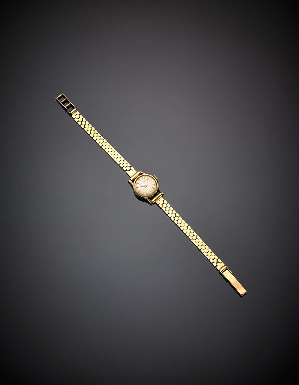 Orologio da polso da donna in oro giallo con bracciale integrato flessibile, g 19,73, lungh. cm 18,50 circa. (lievi difetti)