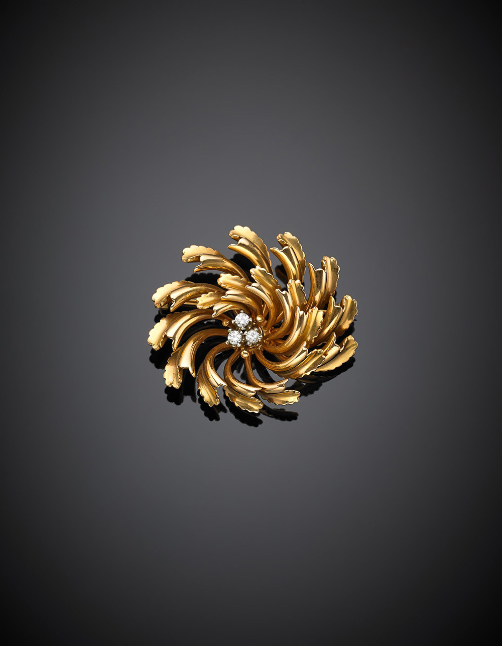 Spilla in oro giallo con foglie a raggiera in oro giallo ed al centro dei diamanti su oro bianco, g 19,58, largh. cm 4 circa.