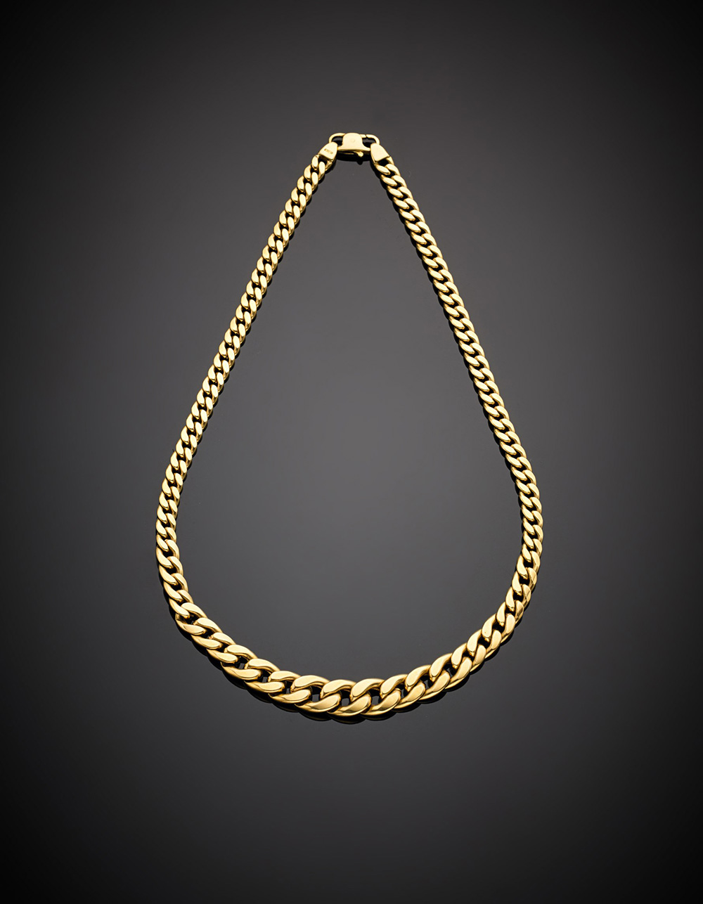 Collier in oro giallo a maglia groumette a scalare, g 21,15, lungh. cm 38,50 circa. Firmato in corsivo URBANO
