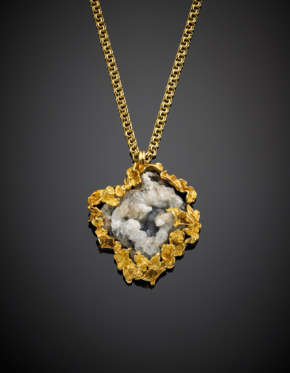 Pendente in oro giallo con geode di quarzo ialino e catena di pertinenza, g 122,30, lungh. cm 7,50, largh. cm 6,30 circa. Firmato DE VECCHI In custodia originale