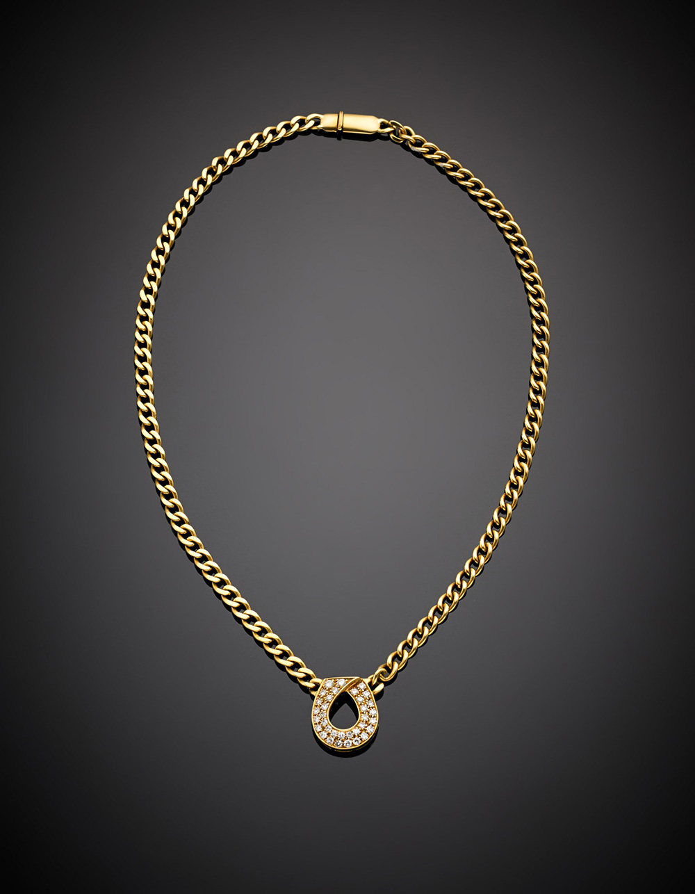 Collier in oro giallo con centrale rifinito CON diamanti rotondi, g 30,69, lungh. cm 42,5 circa.