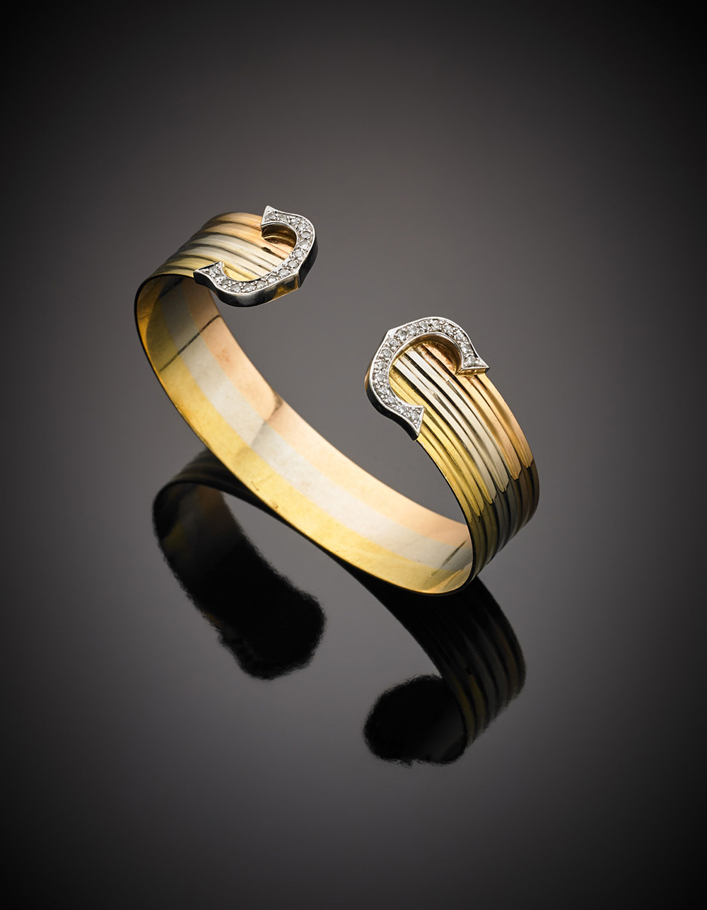 Yellow white and red gold diamond accented bracelet, after "Cartier", g 26.43, diam. cm 6.70.