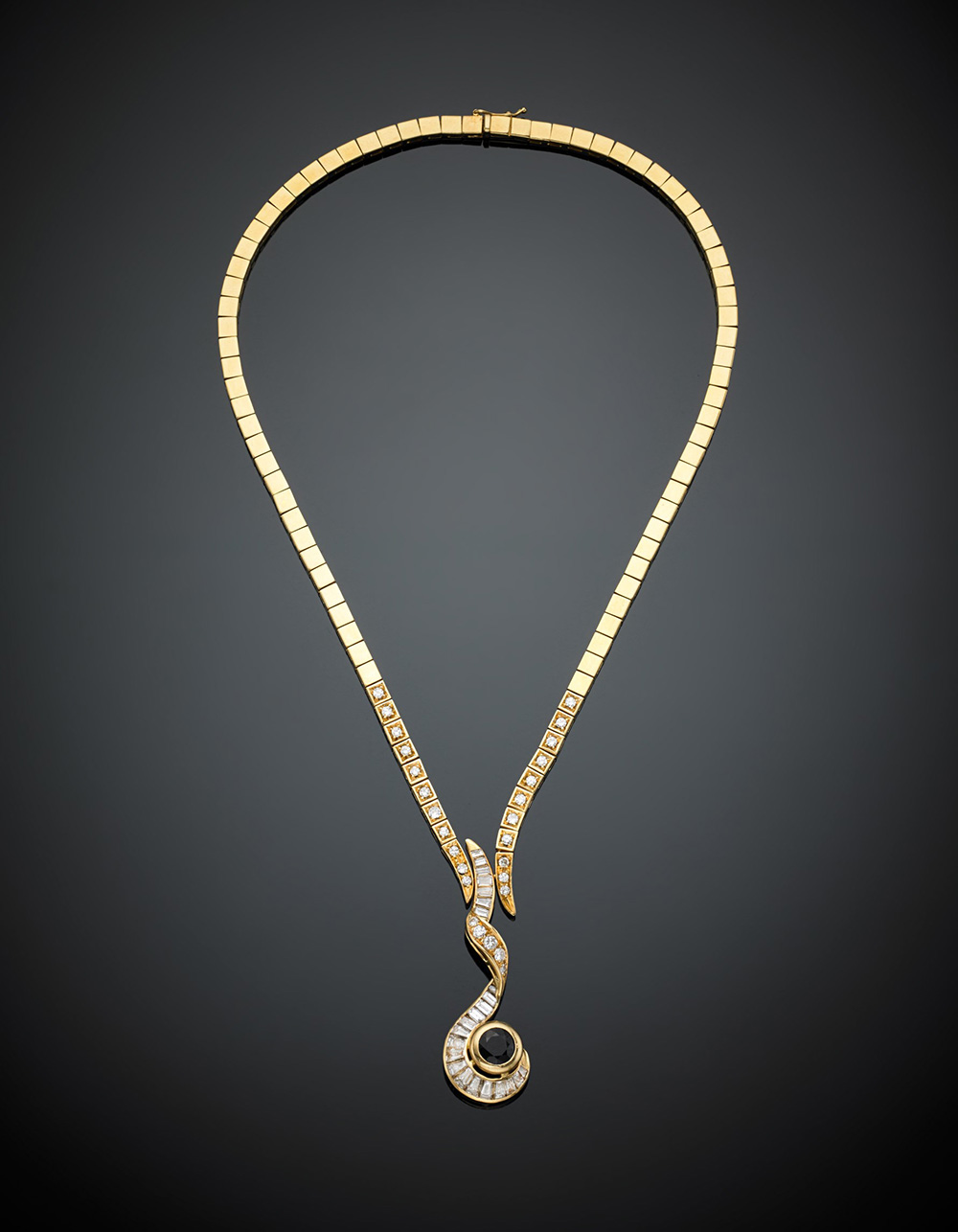 Collier con pendente centrale in oro giallo, diamanti rotondi, baguette e...