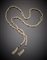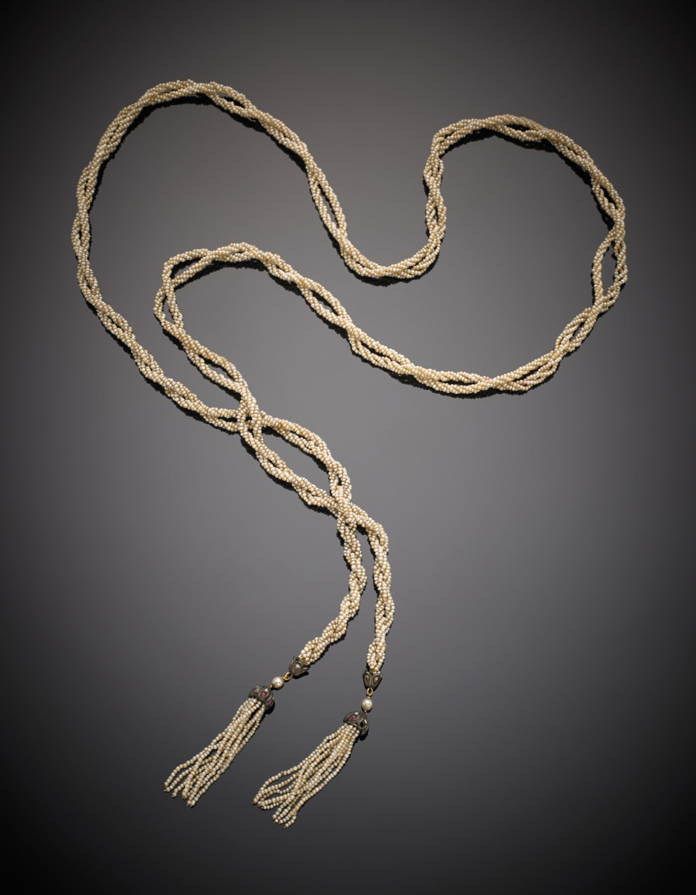 Woven natural seed pearl rope sautoir, ending with silver, diamond and ruby cup tassels, g 34.80, length cm 115 circa.