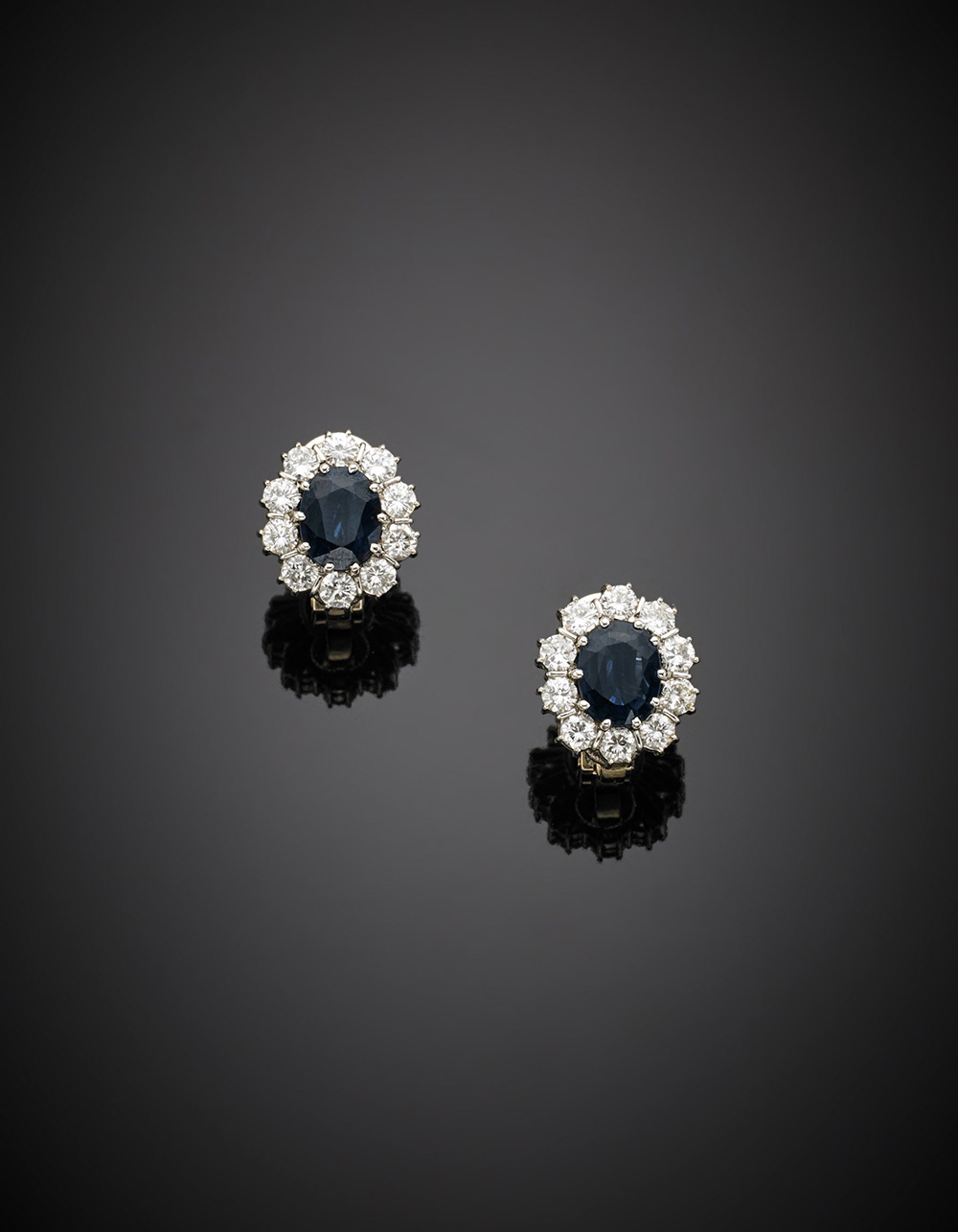 Orecchini a lobo con perno e clip in oro bianco, zaffiri ovali, per complessivi ct. 3,20 circa e diamanti rotondi, per complessivi ct. 2,20 circa, g 9,59.White gold round diamond and oval sapphire clip and stud earrings, diamonds, in all ct. 2.20 circa and sapphire, in all ct. 3.20 circa g 9.59.