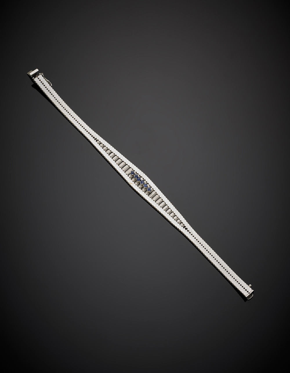 Bracciale in oro bianco a scalare dal centro con zaffiri rotondi,g. 23,50, lungh. cm 18 circa g 23,50, lungh. cm 18 circa.