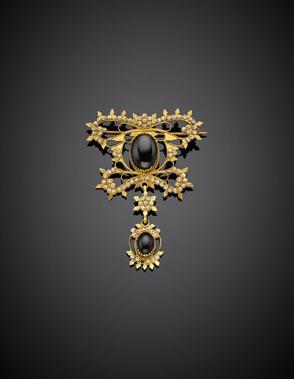 Spilla in oro giallo con micro perle e granati cabochon g 9,48, lungh. cm 6, largh. cm 4,40 circa. Punzonato 16 CA