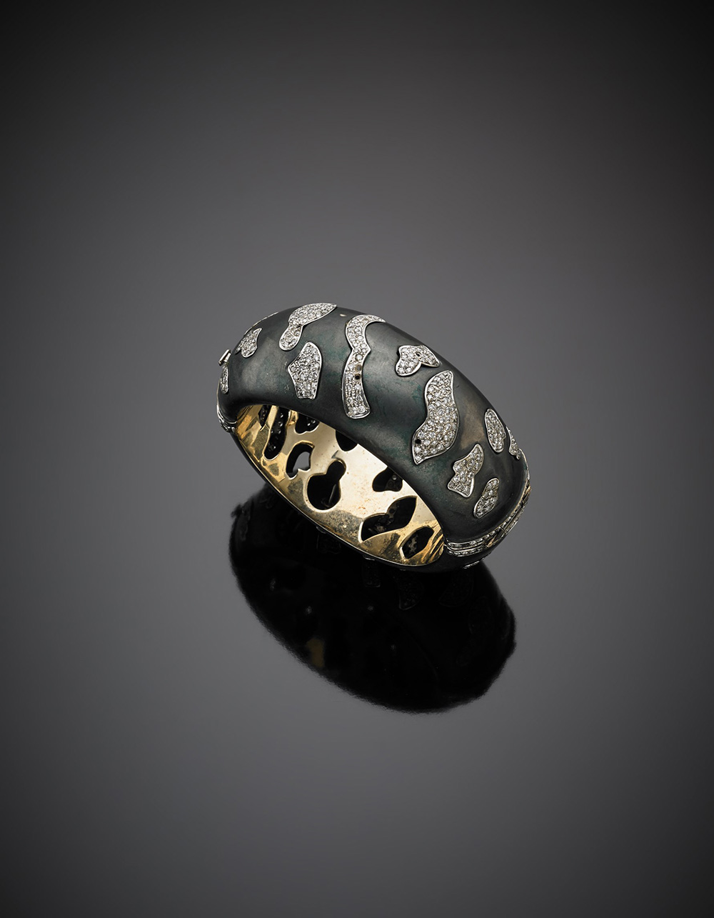 Bracciale rigido, apribile, in oro bianco e metallo brunito con pavè di diamanti, g 144,4. Firmato MARTINELLI (difetti e mancanze)