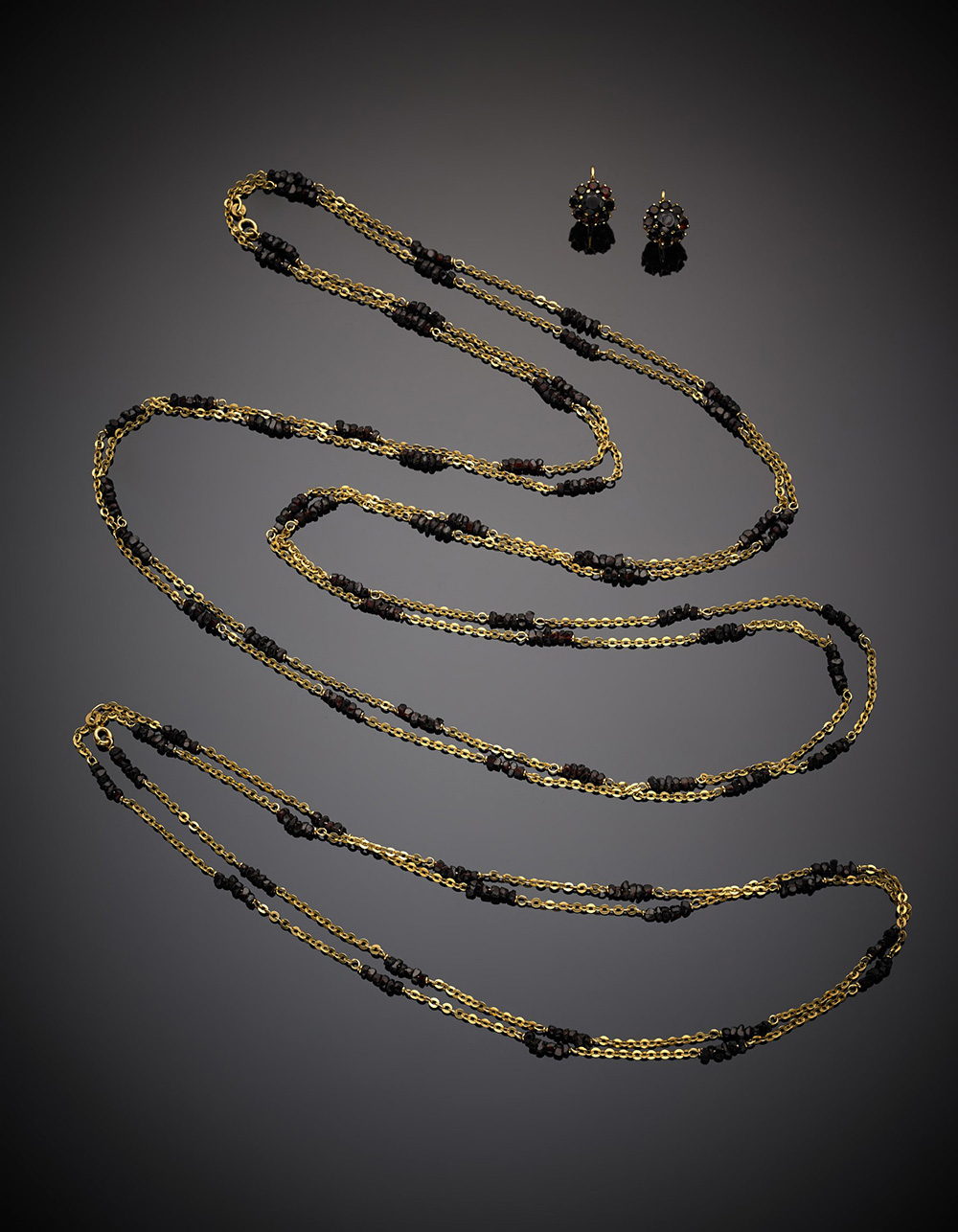 Yellow gold lot comprising two long necklace with garnet spacers and garnet flower earrings, in all g 51.78.