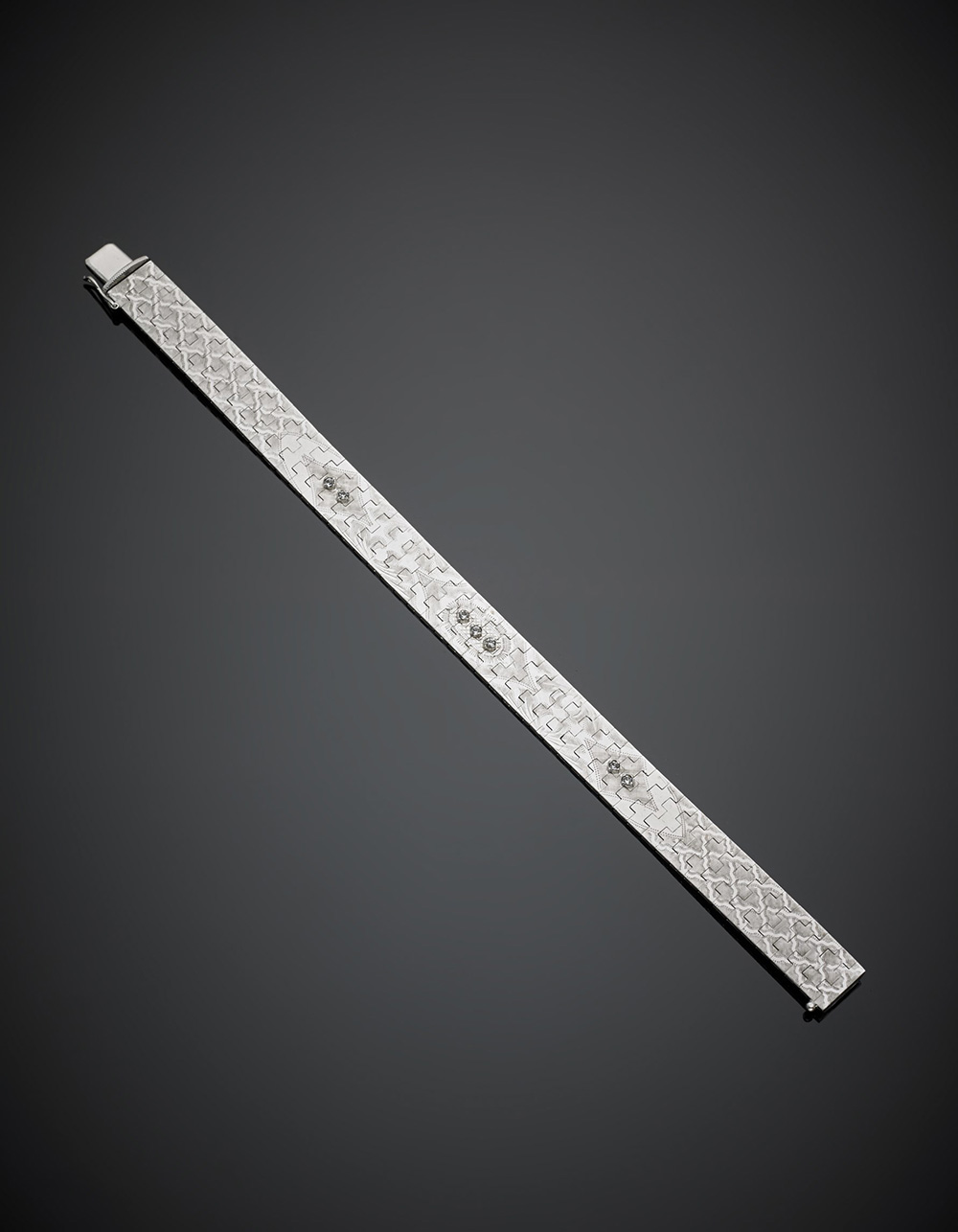 Bracciale in oro bianco, lucido e satinato rifinito con diamanti, g 29,60, lungh. cm 19, h cm 1,10 circa.