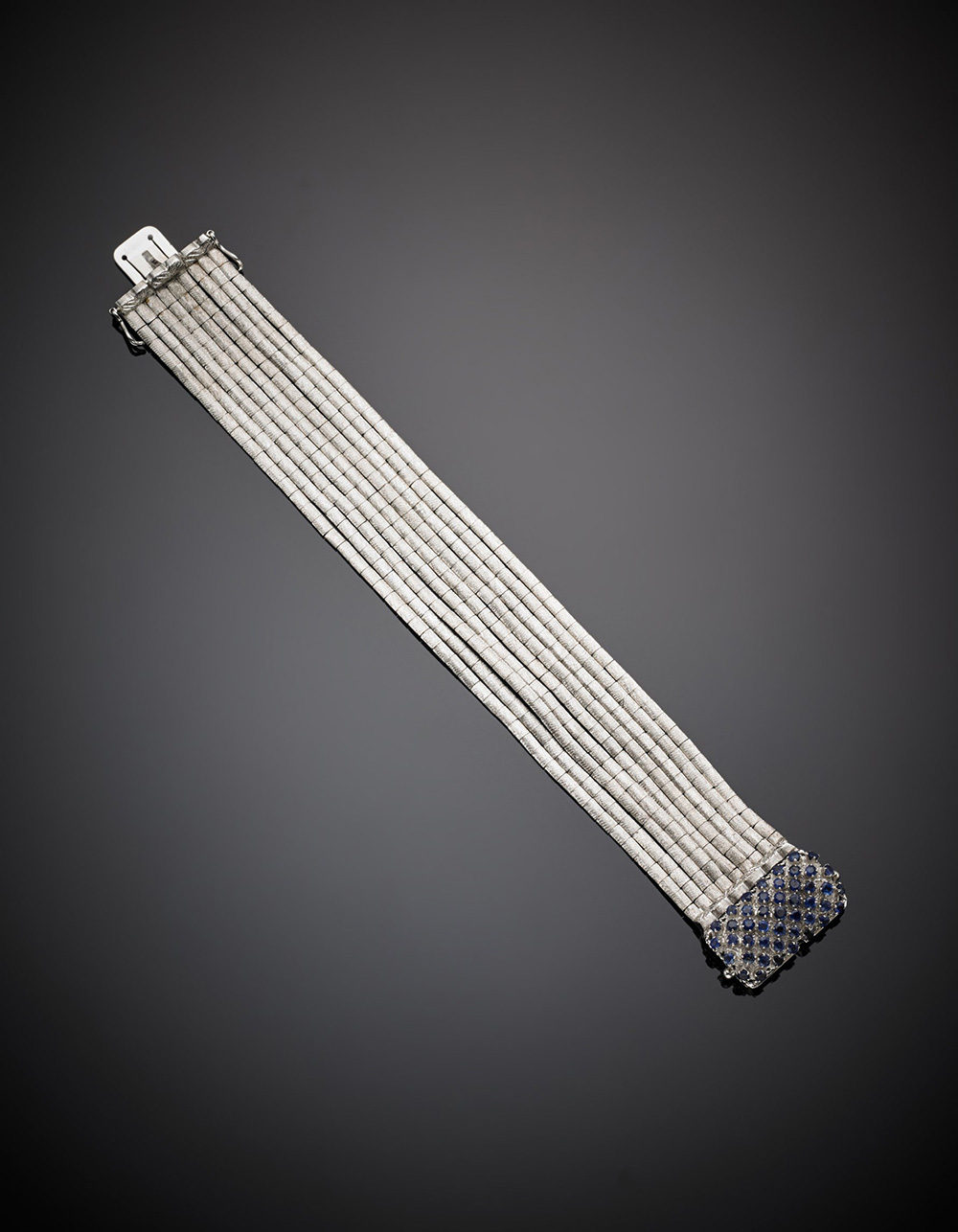Bracciale in oro bianco in parte zigrinato a nove fili con chiusura zaffiri, g 67,61, lungh. cm 19, h cm 2,50 circa.