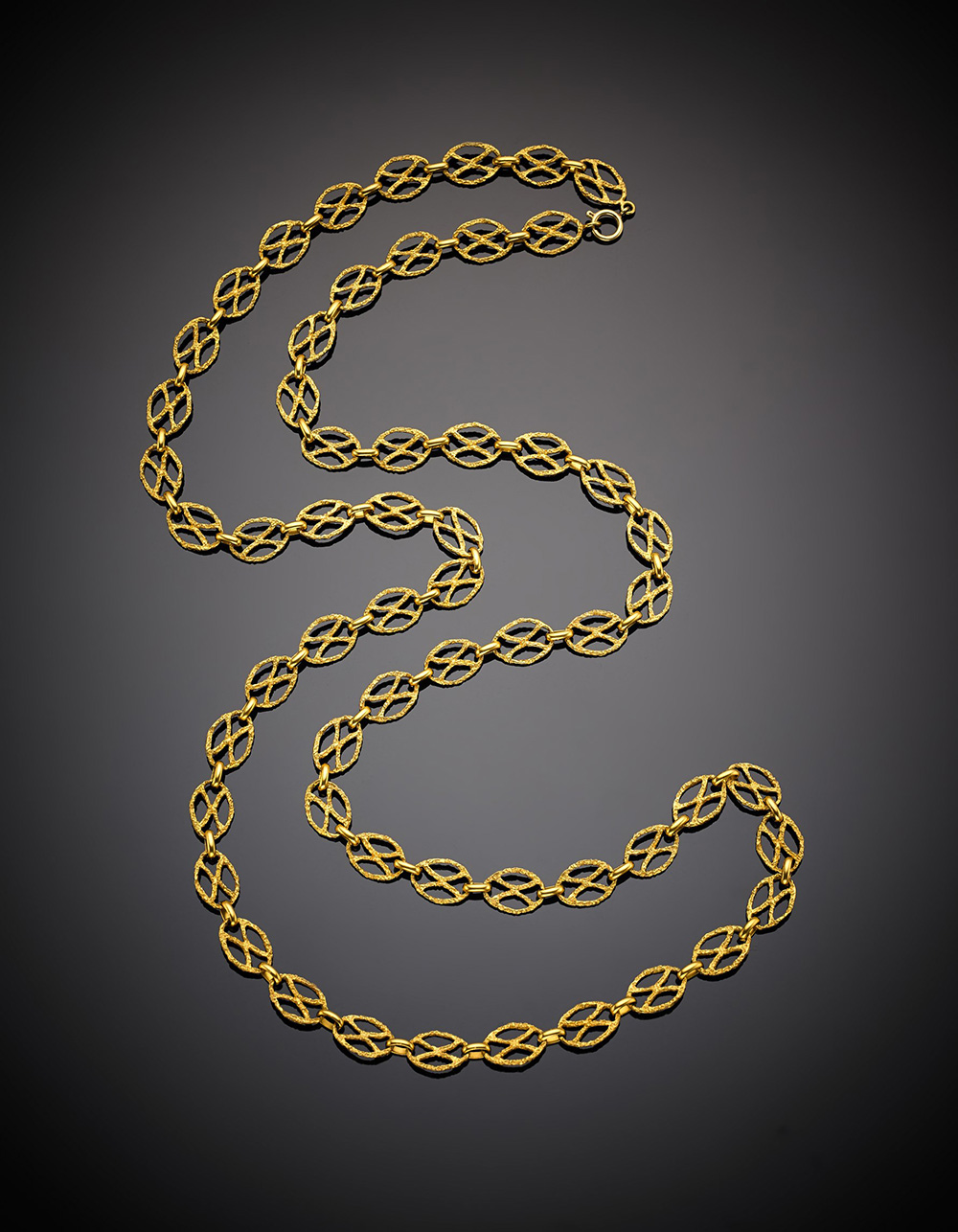 Catena lunga a maglie grandi in oro giallo martellato, g 86,82, lungh. cm 111 circa.