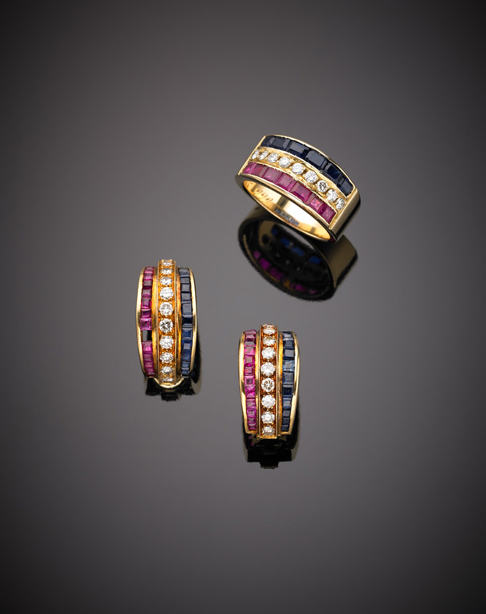 Yellow gold round diamond tapered ruby and sapphire set of jewellery comprising a ring and earrings, in all g 26.80 size 20/60.