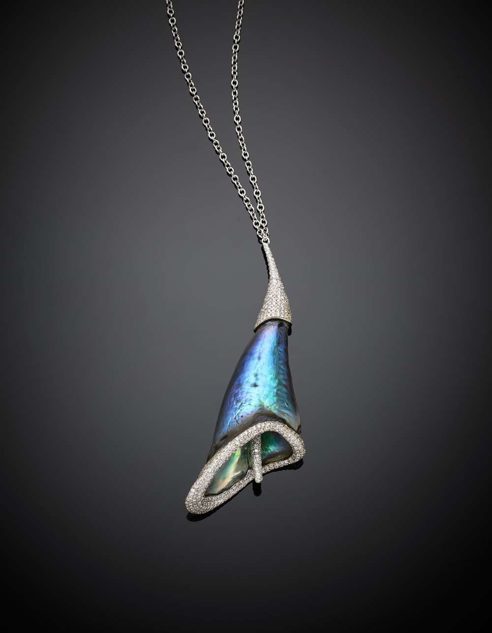 Pendente a forma di calla con perla dei Mari del Sud, con catenina in oro bianco e pavè di diamanti, complessivi g 22,64, lungh. cm 42 circa. Lungh. pendente cm 6.90