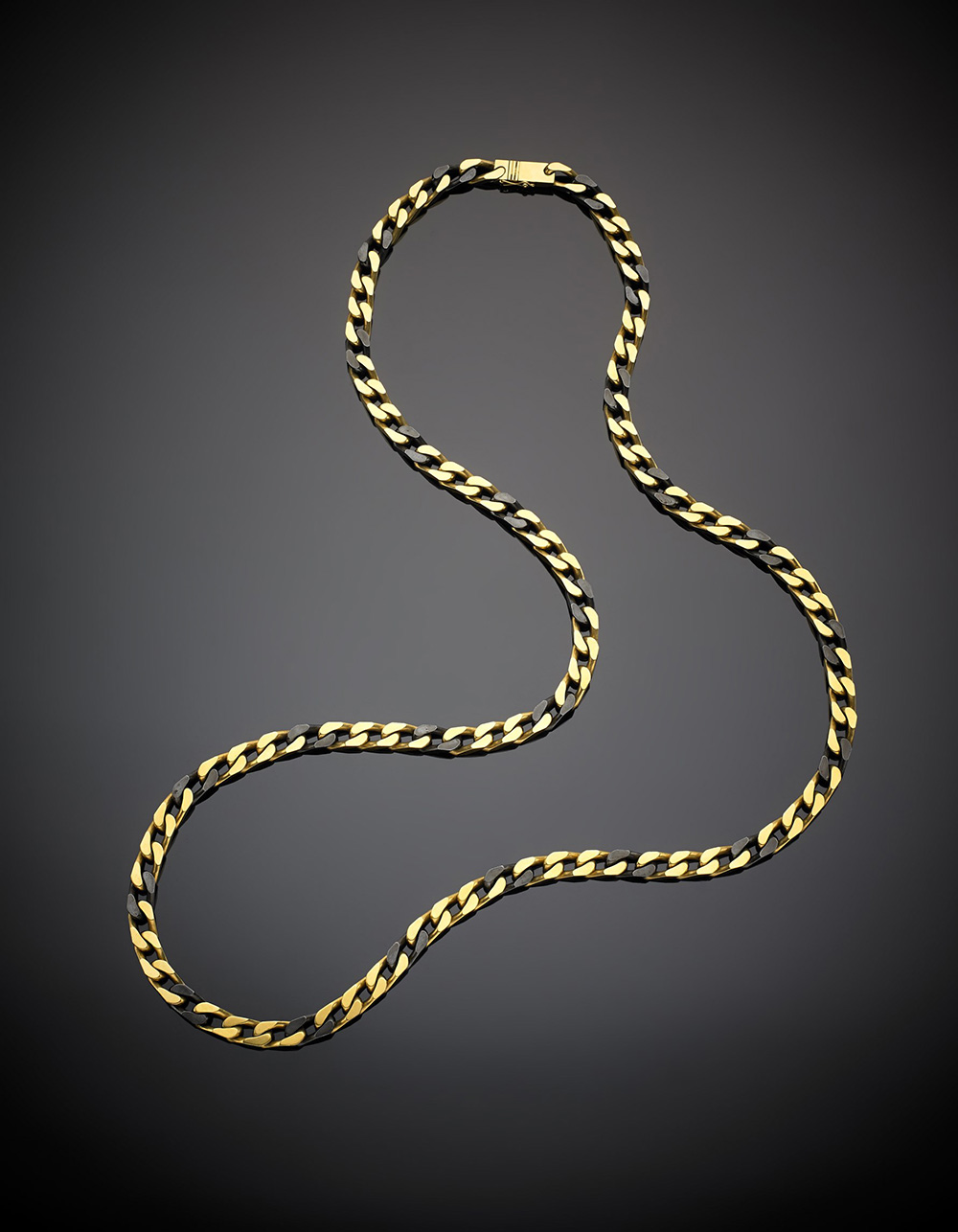 Catena lunga in oro giallo a maglia groumette con intercalate maglie in acciaio brunito, g 213,60, lungh. cm 89,50 circa.