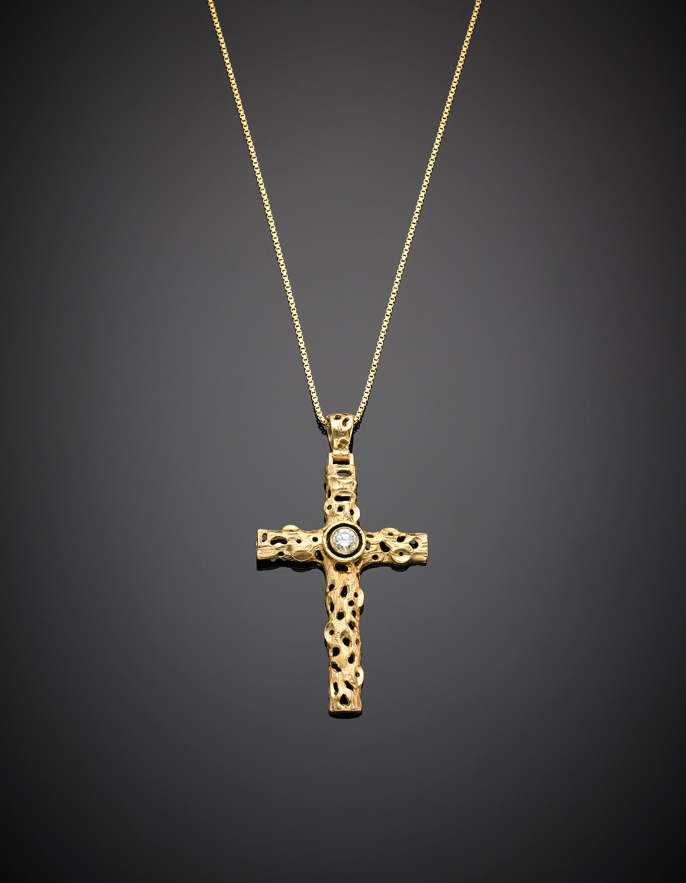 Catenina con croce in oro giallo e diamante di ct. 0,50 circa, g 16,41, lungh. cm 60 circa. Lungh. croce cm 6,50