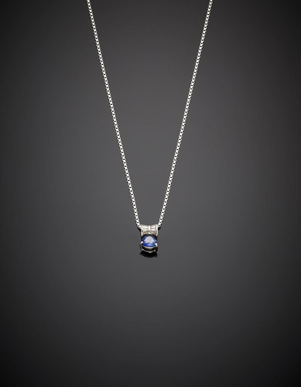 Catenina con pendente in oro bianco, diamanti tapered e zaffiro a goccia, g 10,75, lungh. cm 60 circa.
